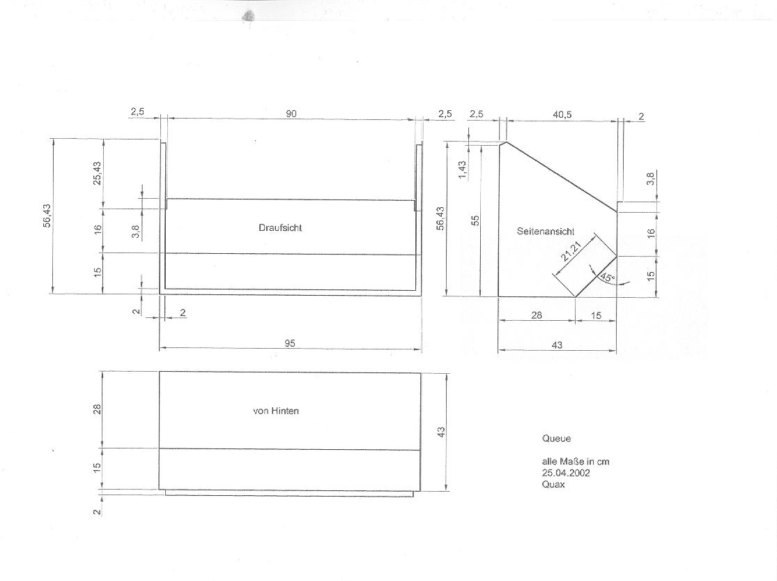 Er besteht aus Alublech und ist vernietet. Die Sache ist durch Manos getestet, der hiernach erfolgreich einen Queue gebaut hat: